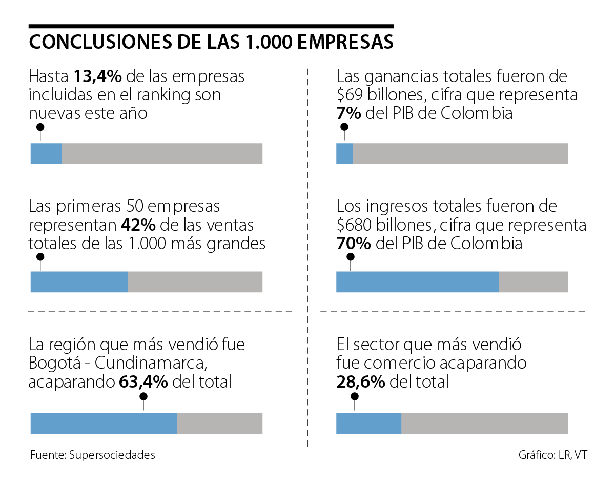 De hecho, los ingresos ascendieron a $680 millones, total que representa 70% del PIB de Colombia, que llegó a $976 millones. Además, el ejecutivo destacó que las primeras 50 empresas representan 42% de las ventas totales de las 1.000 más grandes.
