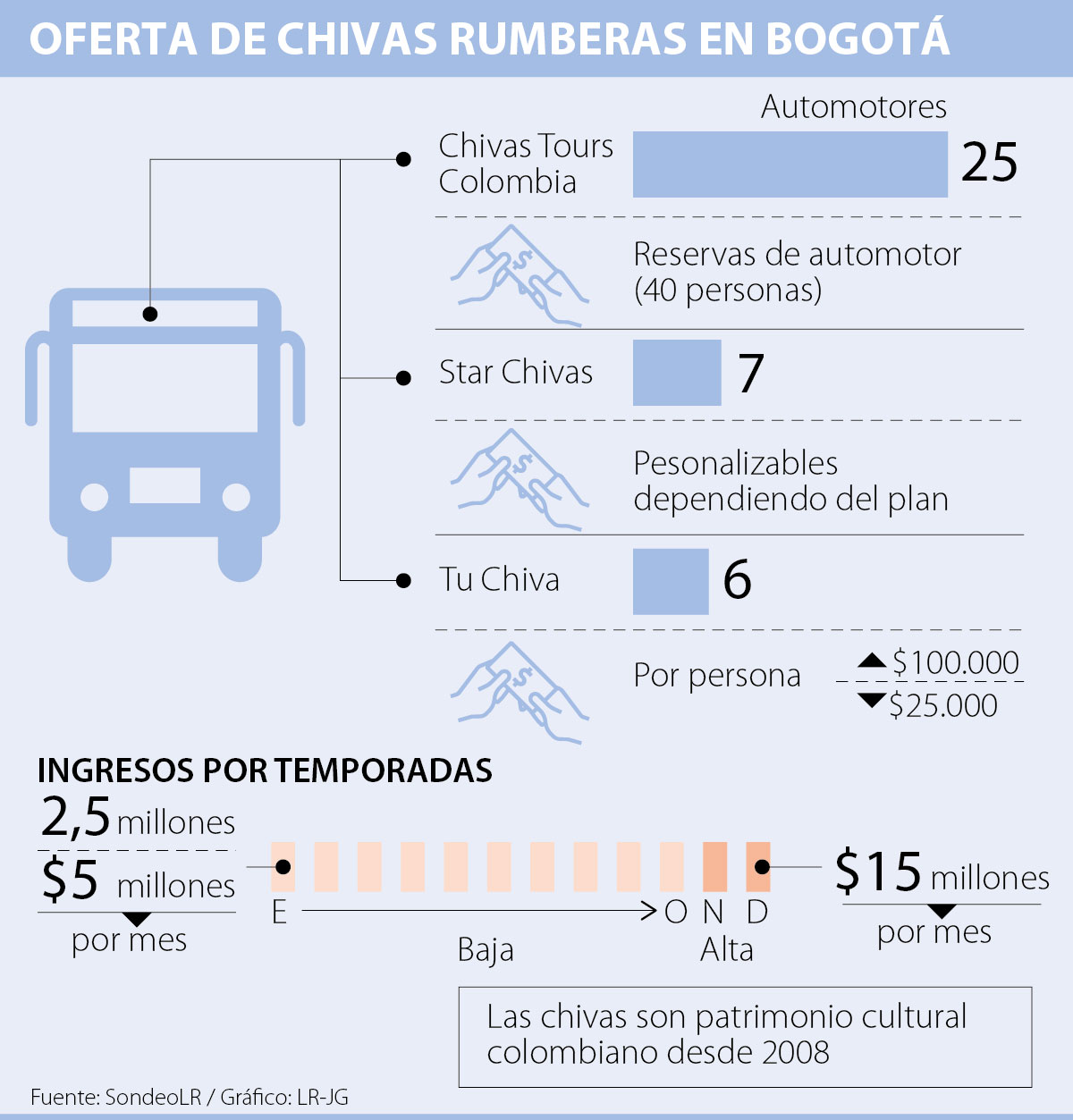Pero esta no es la única forma de cobrar, puesto que compañías como Tu Chiva ofrecen un cobro por el alquiler del vehículo de 40 puestos y otras empresas, como Star Chivas, tienen en su oferta elementos como ponchos o sombreros, además de bebidas alcohólicas.