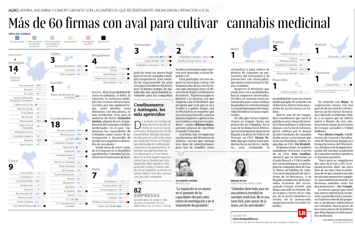 De ahí, que varias corporaciones ya tengan claros sus proyectos en Colombia. En el caso de la firma local Khiron, que recientemente anunció su llegada a la Bolsa de Valores de Toronto, su CEO, Álvaro Torres, dijo que espera tener productos listos en 2019 e, incluso, está evaluando la posibilidad de tener un centro médico propio. De acuerdo con el directivo, Khiron tiene un terreno de 4,5 hectáreas en Tolima.