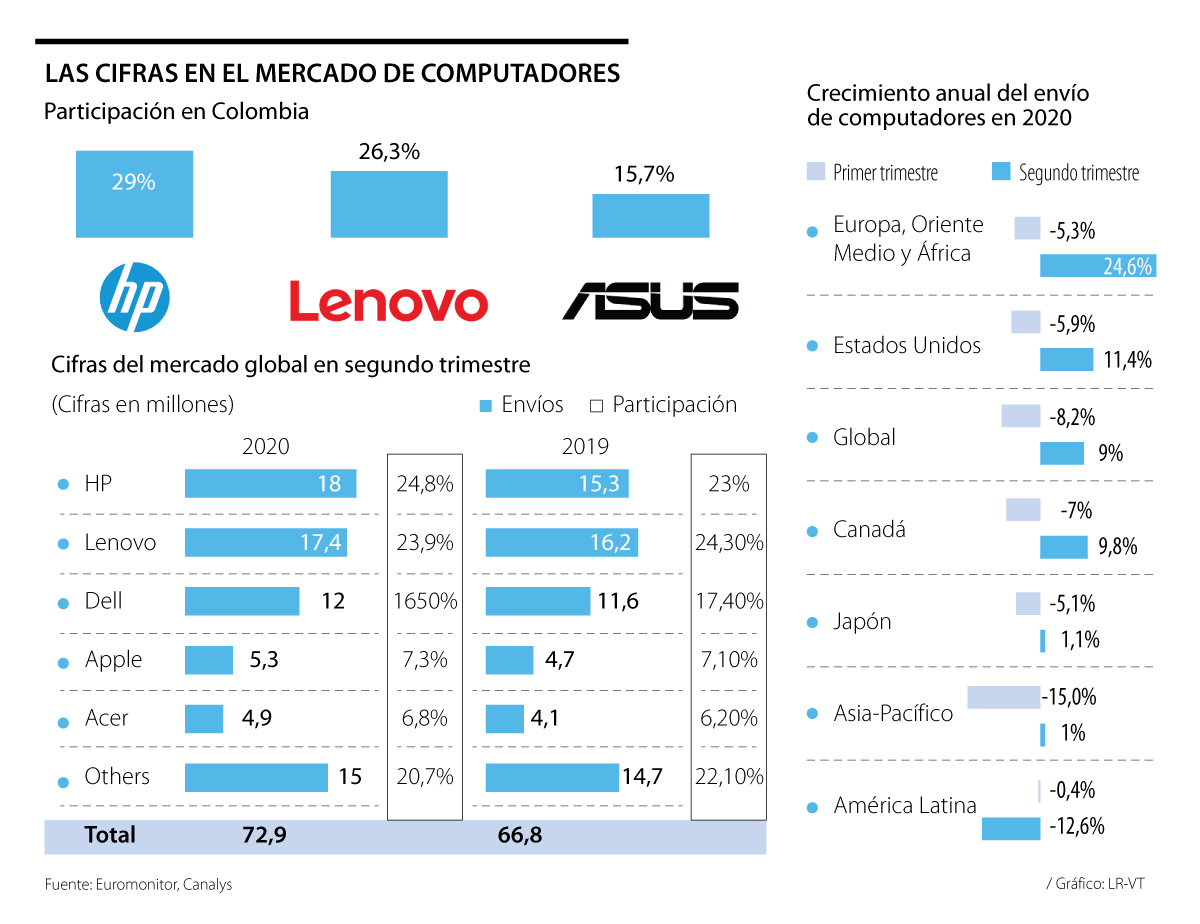 Esta cifra la dio Germán Hernández, gerente de ventas de consumo en HP Inc. Colombia, compañía que lidera el mercado con 29% de la torta según cifras de Euromonitor. A esta compañía le sigue Lenovo con 26,3% de participación de mercado, y en el tercer lugar se ubicó Asus con 15,7% del mercado.