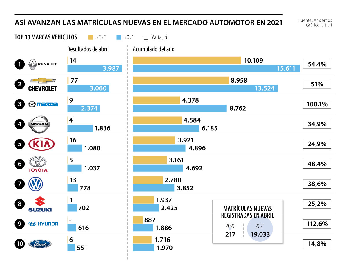 Es por eso que en el top cinco de marcas con más unidades alcanzadas en el cuarto mes del año, Renault mantuvo su liderazgo con 3.987 vehículos y un incremento de 54,4% en el acumulado anual, seguido por Chevrolet y Mazda con 3.060 y 2.374 unidades mensuales respectivamente. Luego, se ubicó Nissan, con 1.836 vehículos y Kia, con 1.080.