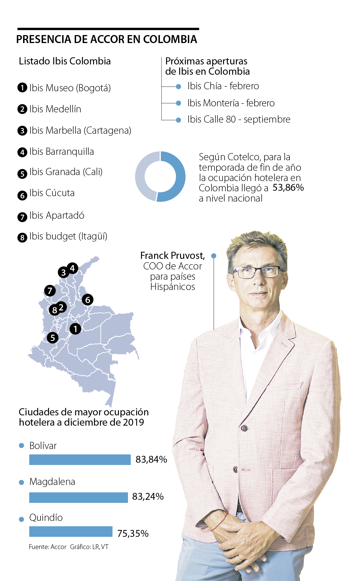 En diálogo con LR, Pruvost dijo que una de las metas más importantes dentro del país para el 2020, tiene que ver con la apertura de tres Ibis más en Bogotá, además de consolidar la ocupación de los hoteles, ya que Colombia es uno de los mercados más importantes para Accor.