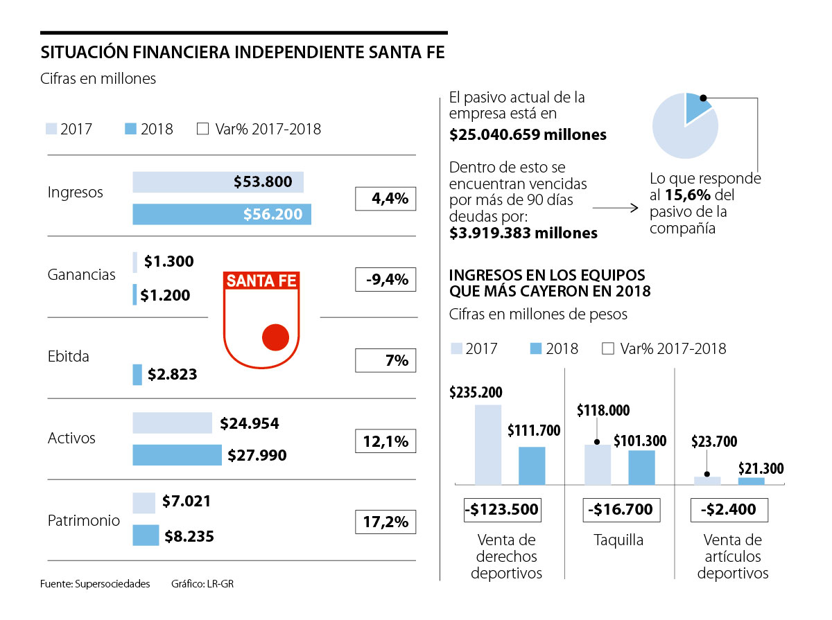 Sobre Santa Fe se conoce que financieramente el equipo atraviesa por una difícil insolvencia, pues entre 2017 y 2018 la sociedad reportó una caída del 9,4% en sus ganancias, pasando de $1.300 millones a menos de $1.200 millones entre los dos años. Pero las cifras más preocupantes al momento tienen que ver con los pasivos de la compañía, ya que se reveló que la cifra está por encima de los $25.000 millones, dentro de las cuales se encuentran deudas por más de $3.000 millones vencidas por más de 90 días.