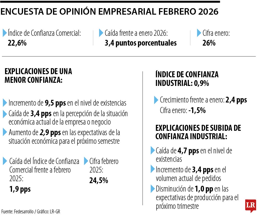De acuerdo con la Encuesta de Opinión Empresarial, de Fedesarrollo, este ítem se ubicó en 22,6% para el segundo mes del año, a comparación de 26% a inicios de 2026