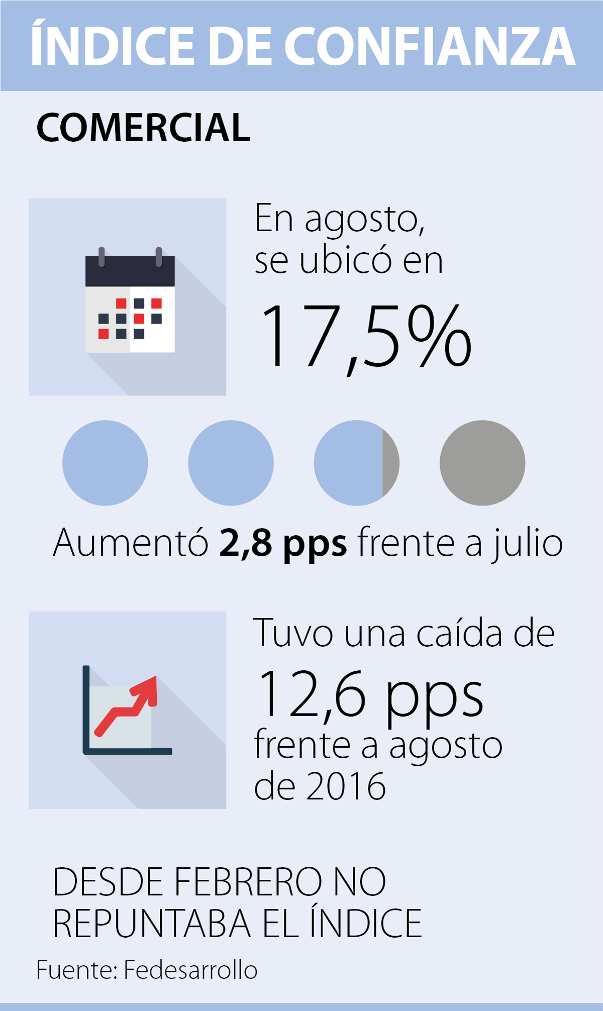 El Índice de Confianza Comercial se ubicó en 17,5%, lo que representó un aumento de 2,8 puntos porcentuales con respecto al mes anterior y una caída de 12,6 pps frente a agosto del año pasado.