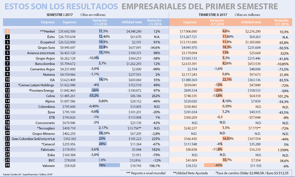 El ranking por ingresos es liderado por Grupo Éxito, Ecopetrol, Grupo Sura y Avianca que lograron esquivar las dificultades del mercado interno y crecer muy por encima de la economía. En el caso de Grupo Éxito, sus ventas sumaron $26,7 billones, cifra que representó un incremento de 12,4%, a la vez que sus utilidades aumentaron en el semestre a $61.670 millones.