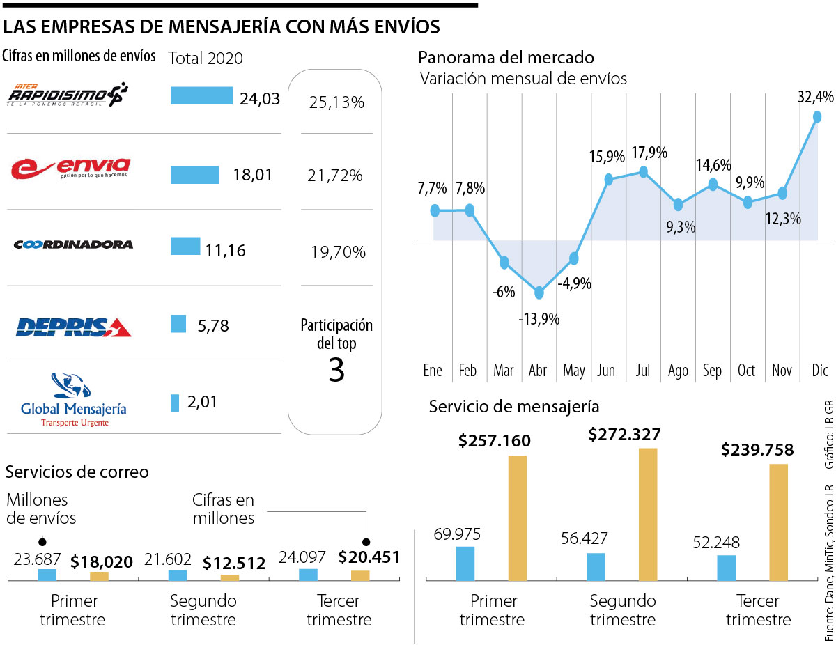 Envía Colvanes le siguió el paso con 21,72% de participación en el mercado y 18 millones de envíos en el año. El tercer trimestre de 2020 fue el más significativo para la compañía, con 3,5 millones de envíos.