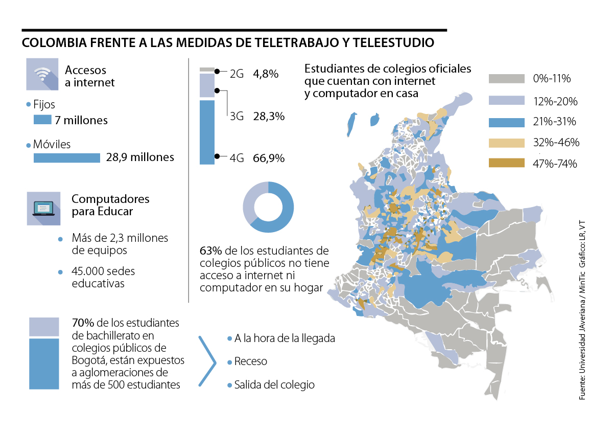 Sin embargo, cifras del Laboratorio de Economía de la Educación (LEE) , en cabeza de Luz Karime Abadía, de la Universidad Javeriana, revelaron que 96% de los municipios del país no podrían implementar lecciones virtuales porque menos de la mitad de sus estudiantes de 11 tiene computador e internet en sus hogares.