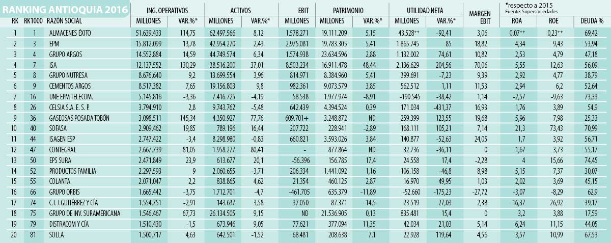 El balance del territorio paisa indica que, en cuanto a ingresos, Grupo Éxito obtuvo los mejores resultados y reportó $51,6 billones, mientras que Postobón fue la que más creció en este indicador con un aumento de 145,34% en ingresos por $3 billones. Respecto a las utilidades, ISA obtuvo el mayor aumento con 204,56% y ganó $2,1 billones y le siguió Postobón con un aumento de 123,55% en sus ganancias.