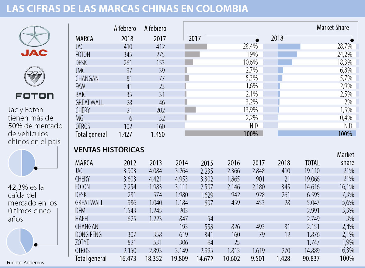 Los bajos costos de los vehículos chinos, la occidentalización de las economías asiáticas y la amplia demanda del mercado colombiano han generado que en los últimos tres lustros el ingreso de marcas chinas sea cada vez mayor. Este segmento, que ya completa 23 diferentes jugadores, hoy es liderado por JAC y Fotón, las cuales controlan 52,9% del negocio.
