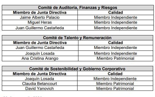 De esta manera se permite además que cada uno de los miembros de la Junta Directiva participe al menos en un Comité. Adicionalmente, se estableció que la presidencia del Comité de Talento y Remuneración, así como la del Comité de Sostenibilidad y Gobierno Corporativo esté a cargo de miembros independientes.