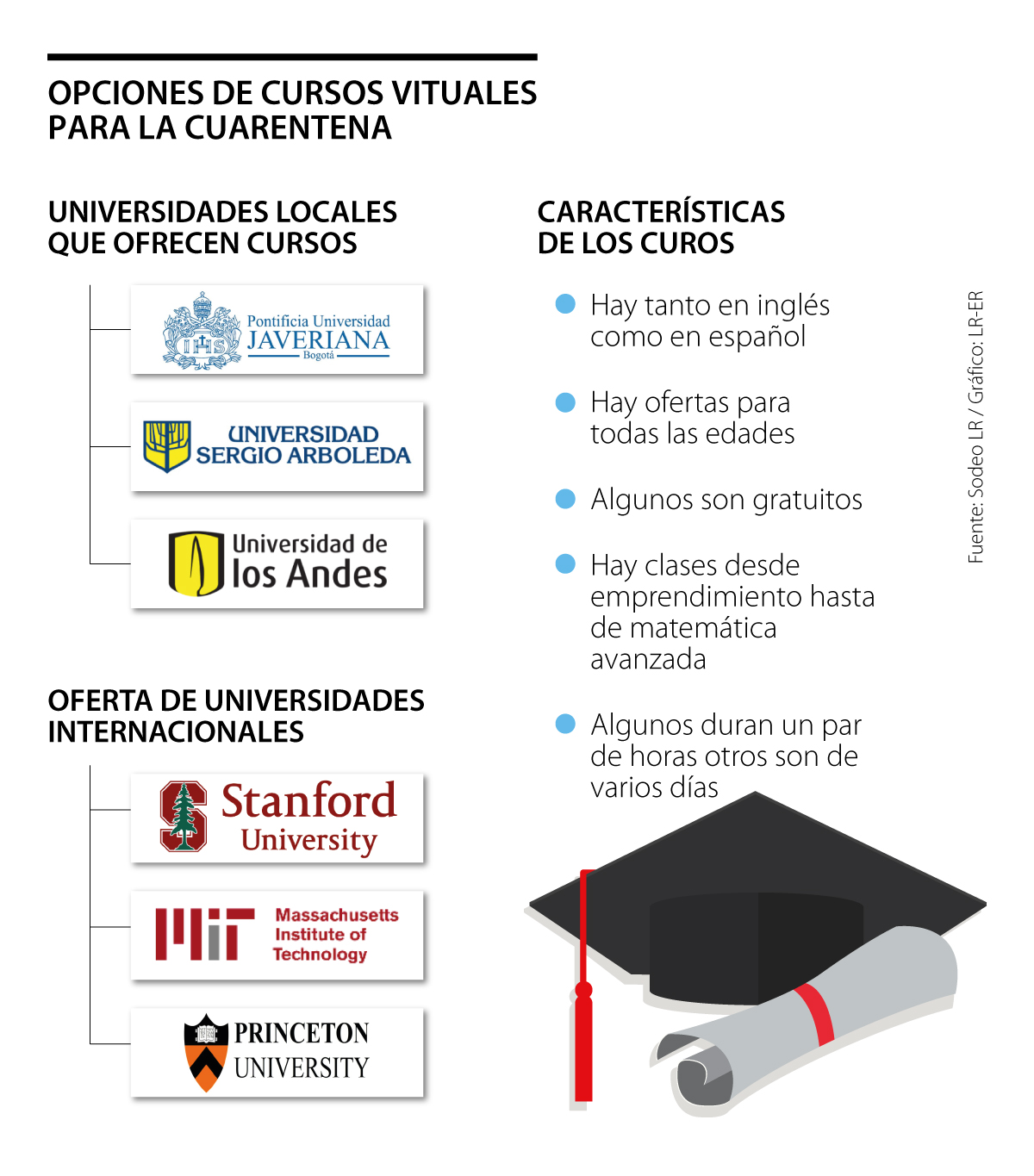 Por ello, LR le trae una serie de opciones académicas que están abiertas a todos aquellos que deseen aprender algo nuevo mientras termina la cuarentena. Entre las instituciones locales que ofrecen cursos para este periodo de tiempo se encuentran la Universidad Javeriana, Universidad de Los Andes y la Universidad Sergio Arboleda.