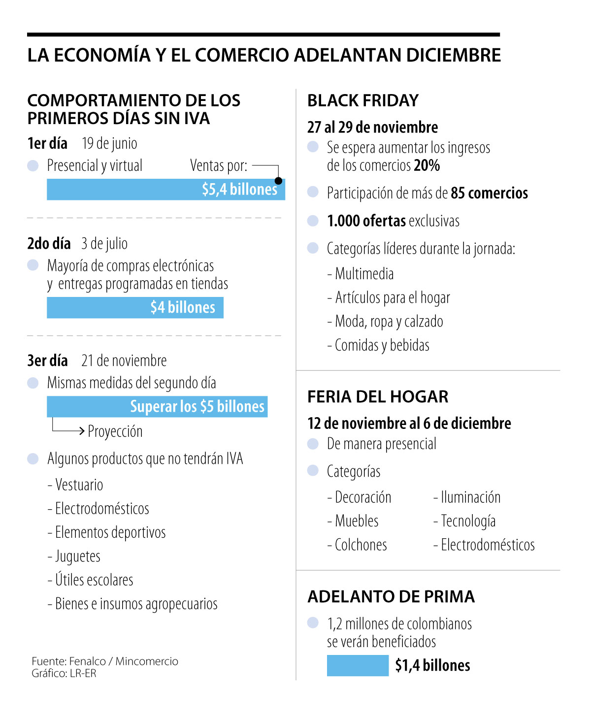 Con el objetivo de impulsar el comercio, la recuperación económica y evitar aglomeraciones, el Gobierno estableció el tercer día sin IVA para el 21 de noviembre. A esta jornada se suma el Black Friday, que se realizará del 27 al 29 de noviembre. De acuerdo con cifras entregadas por el Ministerio de Comercio y la Cámara de Comercio Electrónico, ambas jornadas podrían sumar ventas por $6 billones.