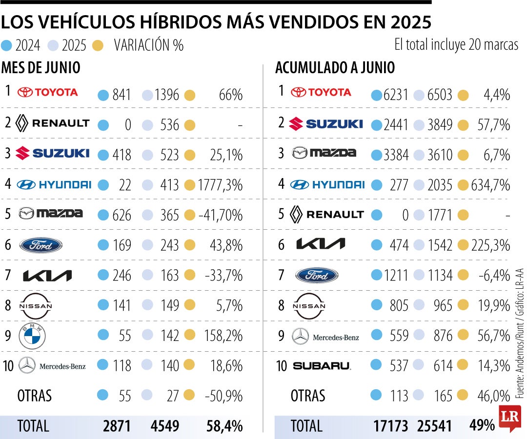 El top 10 lo cerraron Volkswagen y BYD. La marca alemana pasó de vender 696 unidades, en julio de 2024, a 912 en julio de 2025. Tuvo una participación en el mercado de 3,8%. Por otro lado, la marca de vehículos híbridos y eléctricos vendió el doble en comparación al mismo mes del año pasado, pasando de 400 a 806.