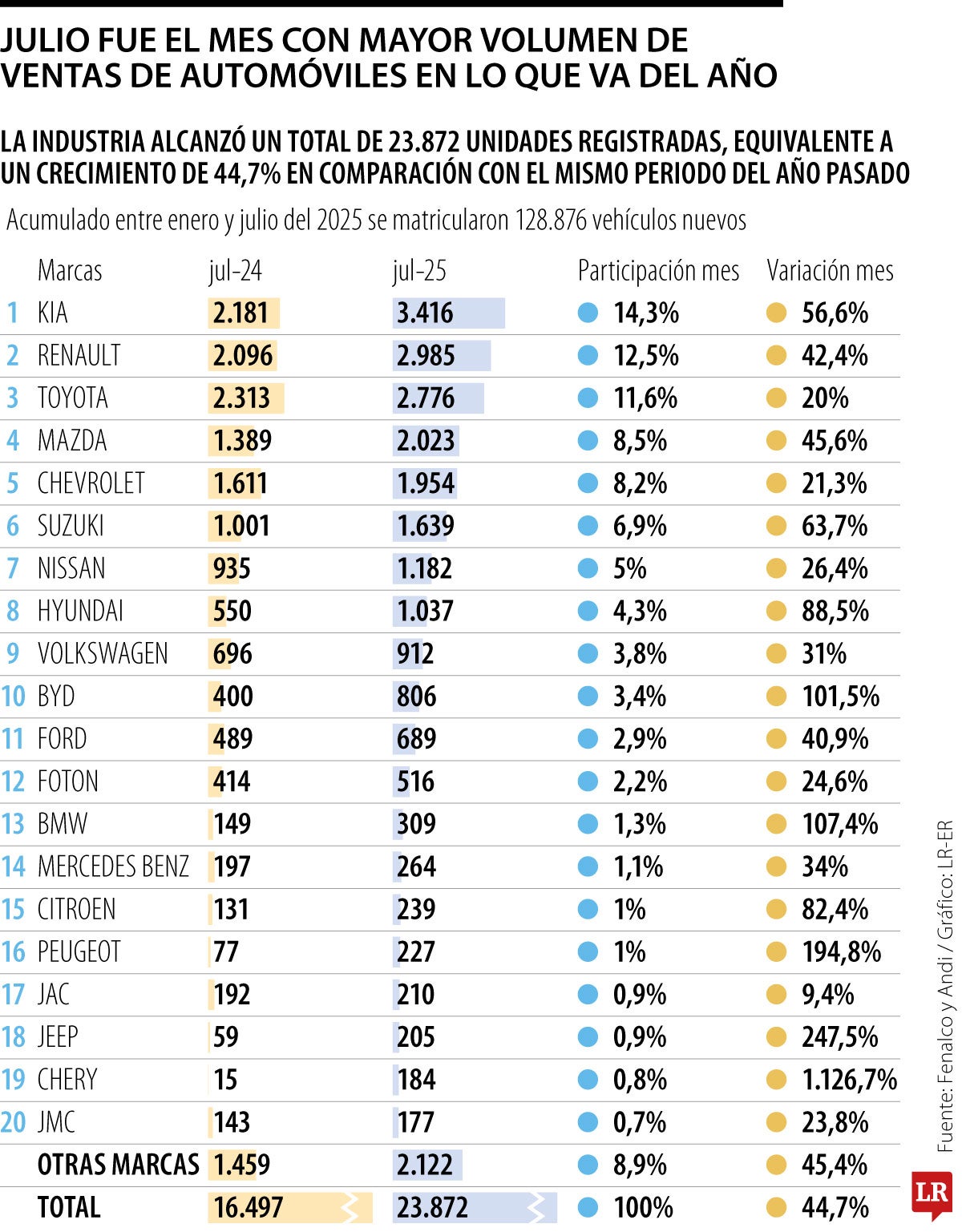 En el informe publicado por Fenalco y la Andi, se evidenció que el séptimo mes del año alcanzó un total de 23.872 unidades registradas. Kia, Renault y Toyota las que más vendieron