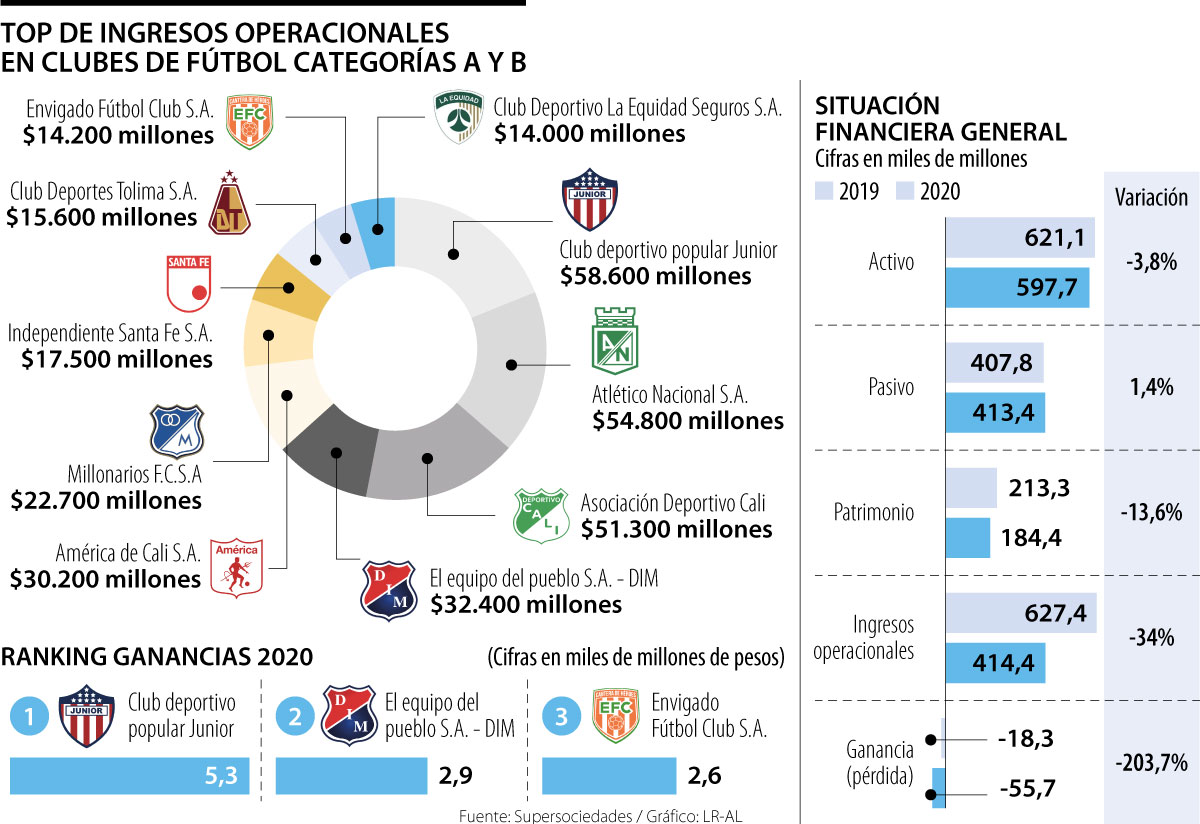 El primer año de la pandemia también reorganizó la lista de equipos de más ingresos. Ahora en el top cinco están Junior, Nacional, Cali, DIM y América, mientras que en 2019 estaban Nacional, Junior, Cali, América, Millonarios y Tolima.