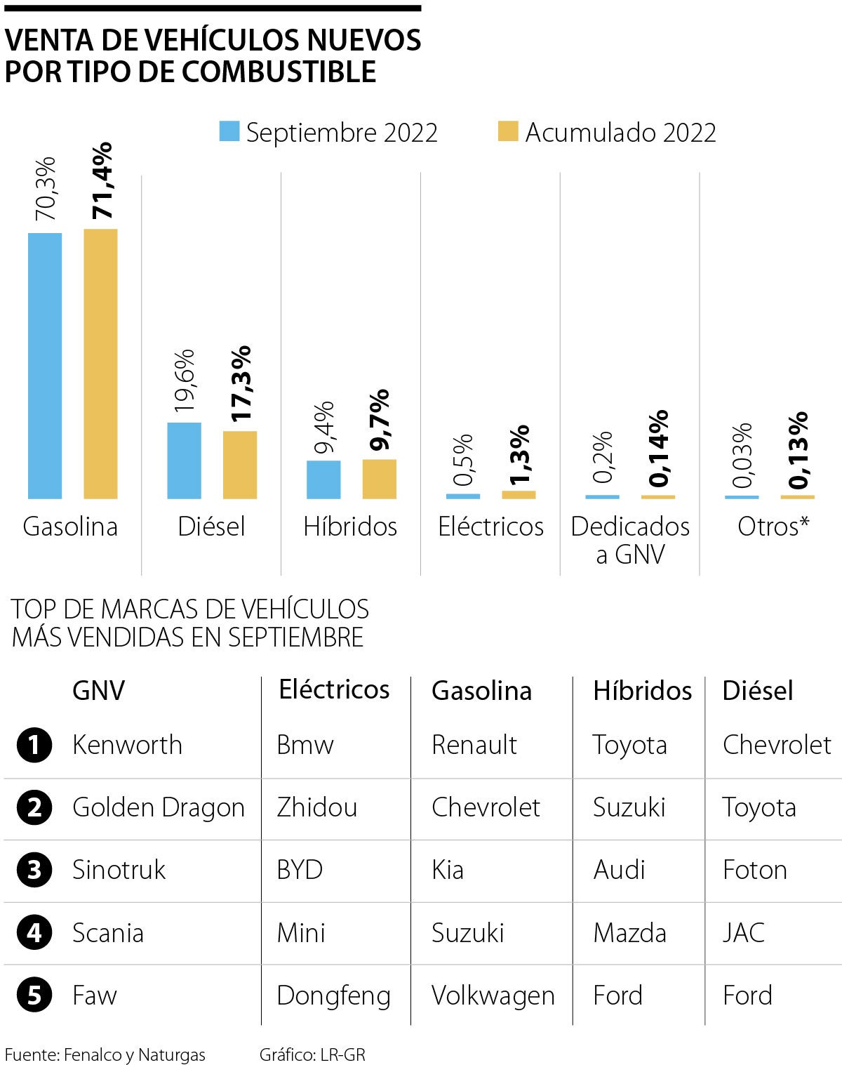 De la cifra total, de vehículos nuevos en septiembre, 70,3% fueron a gasolina; 19,6% a diésel, 9,4% fueron híbridos y 0,5%, eléctricos, de acuerdo con el segundo informe de Fenalco y Naturgas sobre las fuentes de energía alternativa y combustibles.