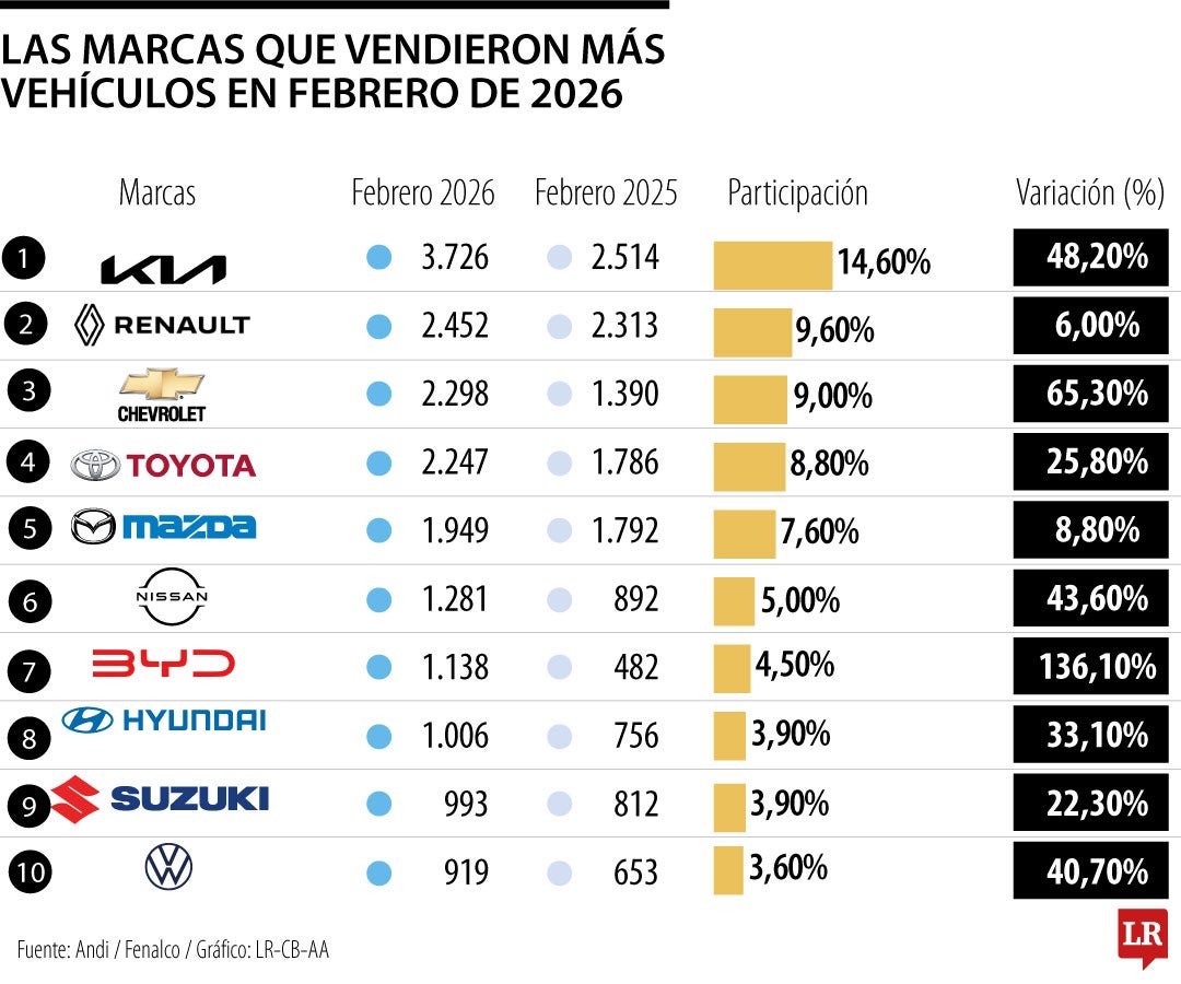 Kia, Renault y Chevrolet lideraron las ventas de vehículos nuevos en febrero de 2026