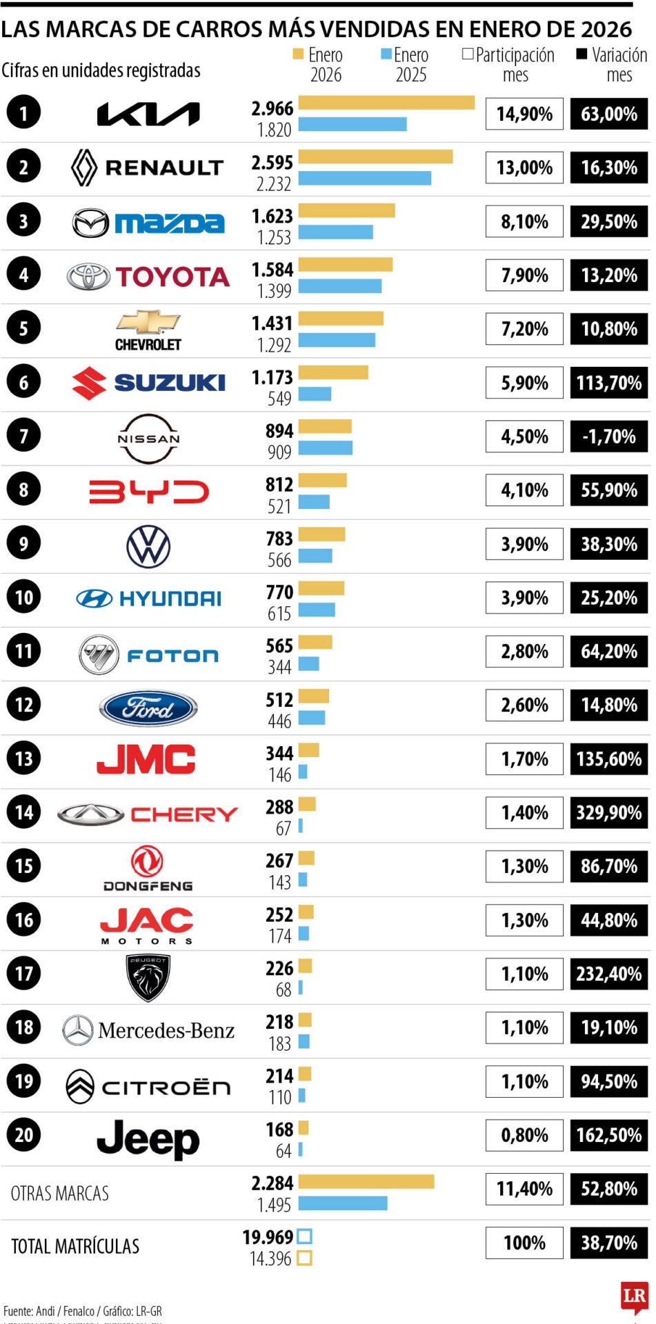 A esta le siguió Renault, con 2.595 unidades vendidas, una cuota de mercado de 13% y una variación de 16,3% frente a enero del año pasado; y Mazda, con 1.623 vehículos registrados, una participación de 8,1% y un crecimiento de 29,5% respecto a enero de 2025.