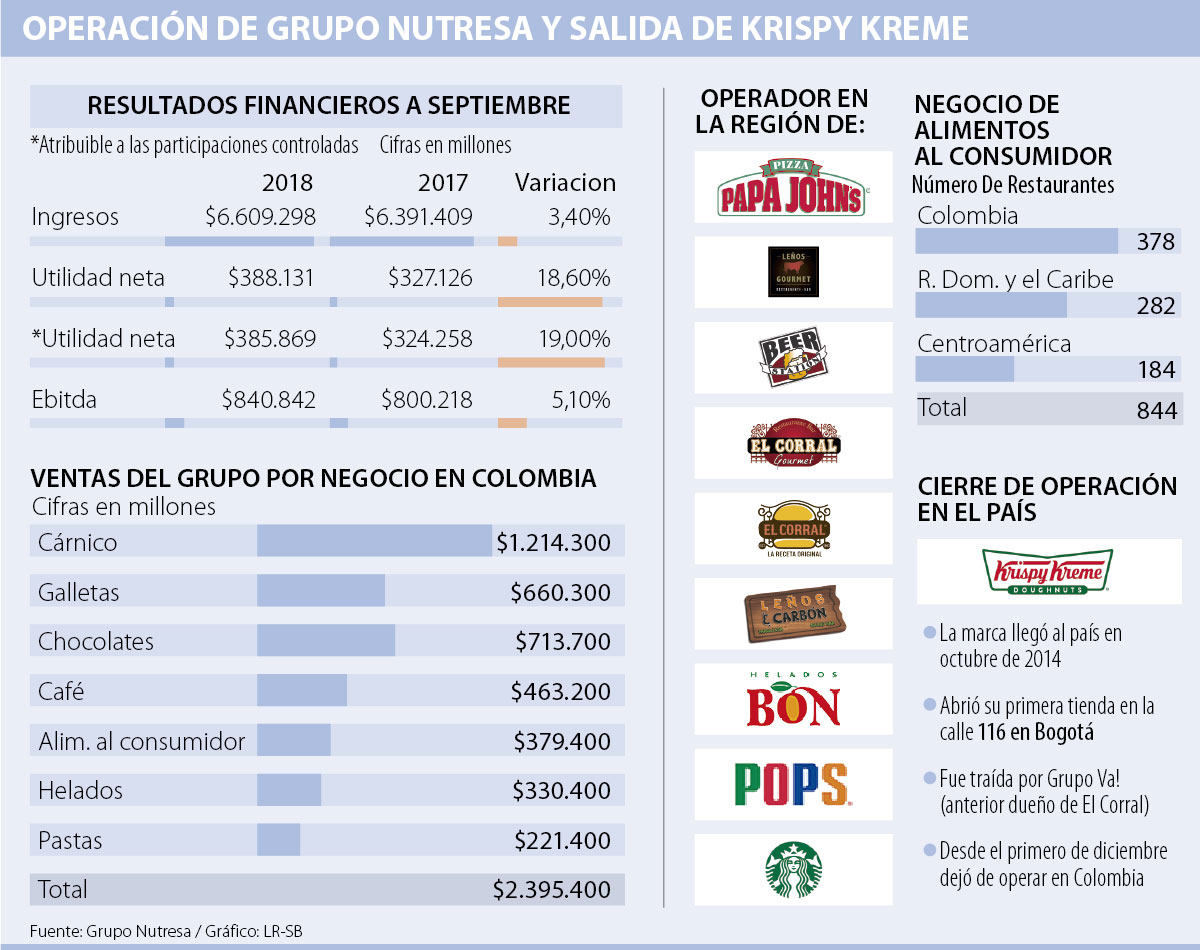 El anuncio lo hizo Grupo Nutresa, a través de una de sus compañías, la Industria de Restaurantes Casuales S.A.S. (Ircc), pues el holding asumió la operación de Krispy Kreme el 27 de noviembre de 2014. La transacción surgió de la compra del Grupo El Corral (El Corral, Papa John’s, Corral Gourmet, Beer Station, La Yarda, Leños y Carbón, Leños y Carbón Gourmet, Gratto, Schapeli y Yogen Früz) por parte de Nutresa por un monto de $830.000 millones.