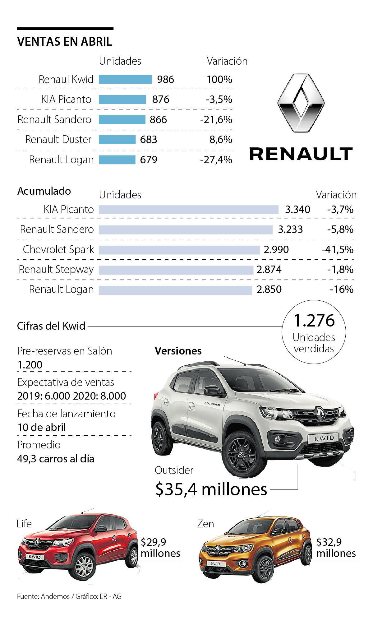 Tras el éxito que tuvo durante el Salón Internacional del Automóvil, con 1.200 pre-reservas de clientes que ni siquiera lo habían visto, al cierre de abril el Renault Kwid logró posicionarse como el vehículo más vendido del mes, según el informe presentado por la Asociación Colombiana de Movilidad Sostenible (Andemos).