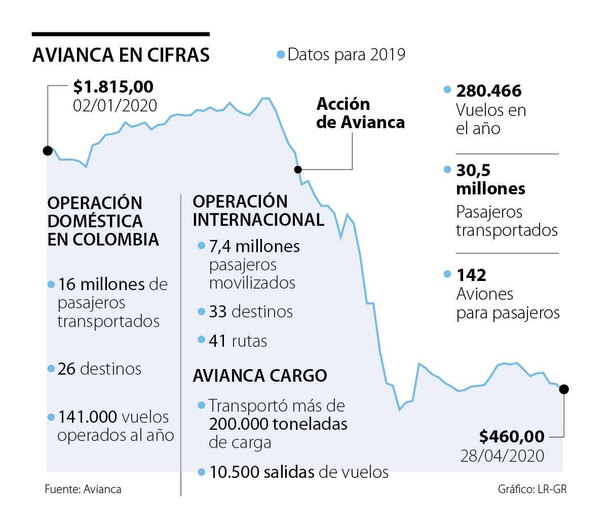 El día que se registró el primer caso de covid-19 en Colombia, el 6 de marzo, la acción cayó 9%; el 19 de marzo, cuando el presidente Iván Duque decretó el cierre de la llegada de vuelos internacionales, registró una caída de 27%. Al cierre de mercado del 28 de abril el precio del título de Avianca ya se ubicaba en $460.