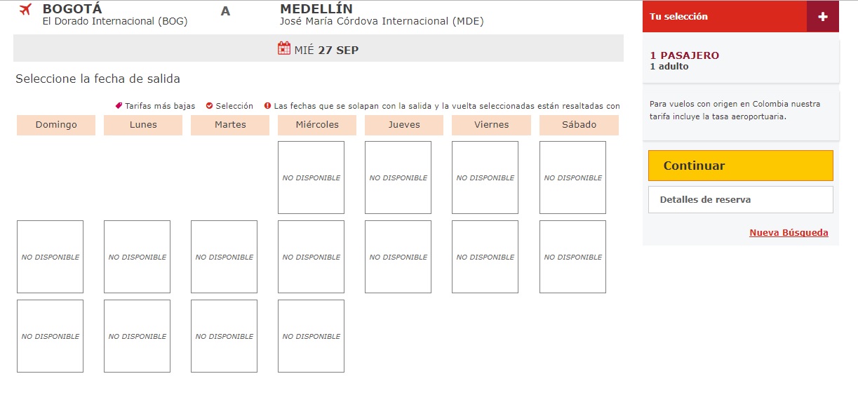 En la página web al intentar hacer una reserva para días cercanos no hay disponibilidad de vuelos.