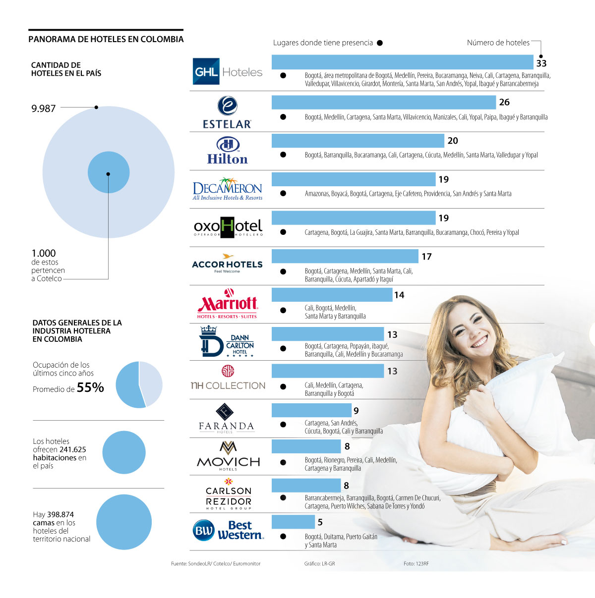 Actualmente, el líder del negocio hotelero en Colombia es la cadena GHL que cuenta con 33 hoteles en 16 ciudades, seguido de Estelar con 26 en 11 ciudades del país, Hilton con 20 en 10 lugares. El top cinco lo finalizan Decameron con 19 en ocho ciudades y OxoHotel con 19 en nueve ciudades (ver gráfico).