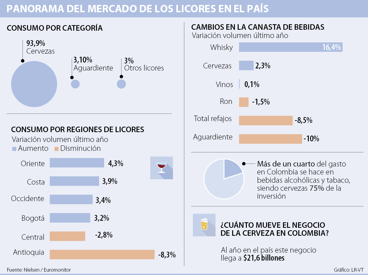 Pero, no solo la cerveza ha ganado terreno, según las cifras más recientes de Nielsen, el whisky ganó 16,4% en términos de volumen frente a otros licores. “El aguardiente sigue fuertemente afectado por las pérdidas de algunos fabricantes en todos sus tamaños, en parte por la llegada de nuevas marcas económicas de otras categorías como whisky”, agregó la firma.