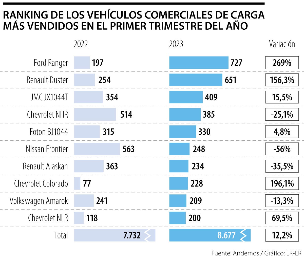 En 2022, la comercialización de la Chevrolet NHR sólo la superaba la Nisan Frontier, que registra 563 nuevas matrículas en 2022 y que, en comparación con 2023, sufre un decrecimiento de 56,0%. El quinto modelo más comercializado en lo que va de este año es la Foton BJ1044, que logró 330 nuevas matrículas; es decir, 4,8% más que en 2022 que comercializó 315.