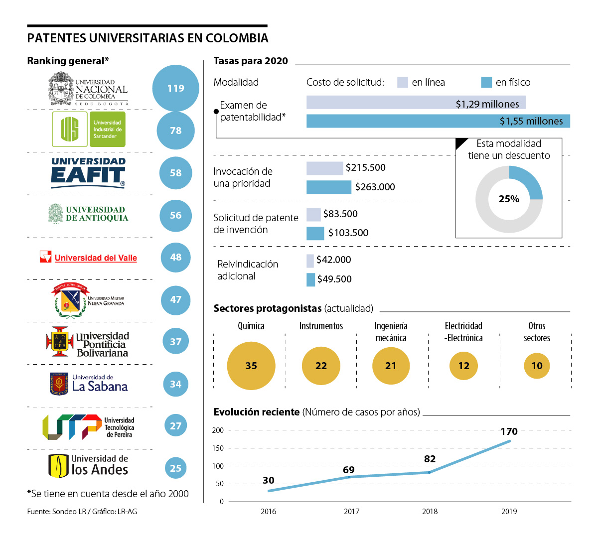 En cuanto a las instituciones que más han contribuido al posicionamiento de las universidades como impulsoras de esta labor, la Nacional lidera el escalafón con 119 patentes concedidas entre 2000 y 2018, de acuerdo con información de la SIC. Le siguen la Universidad Industrial de Santander (UIS) con 78 y la Universidad Eafit con 58.