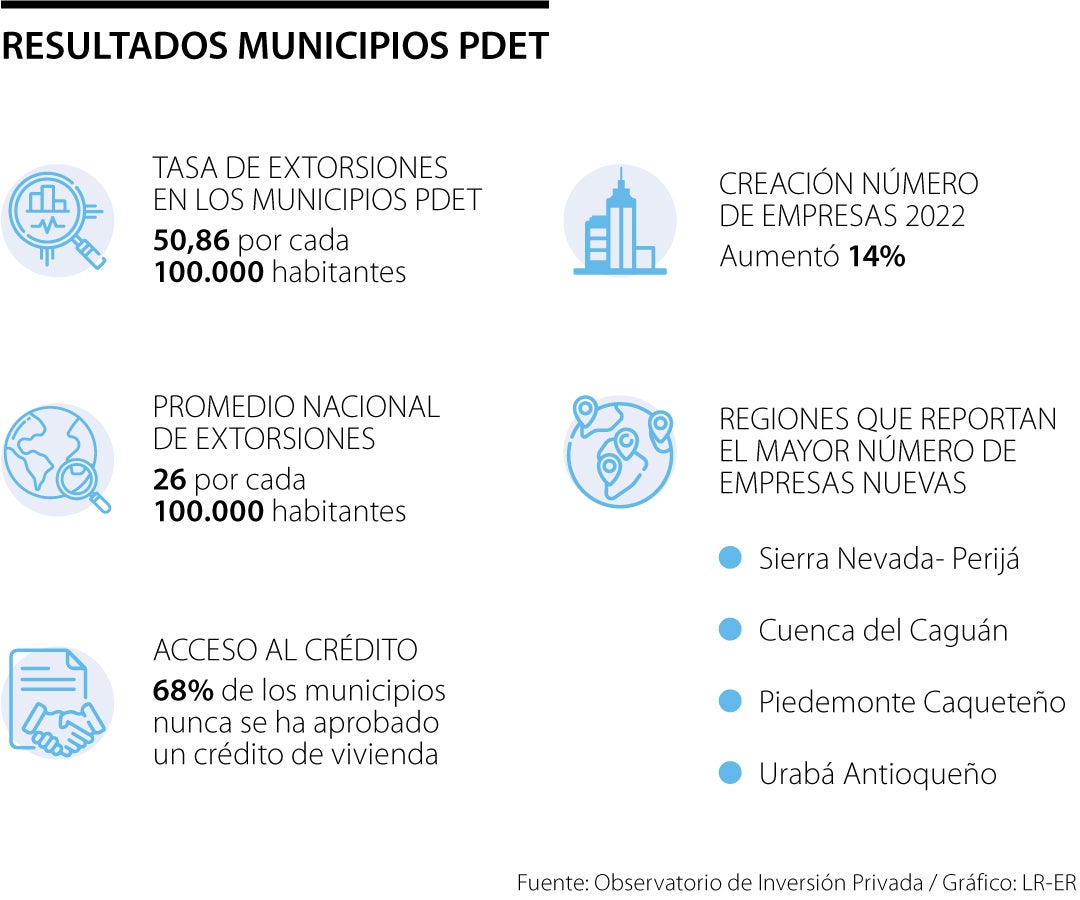 Además, la tasa de extorciones de los municipios afectados por la violencia llegó a niveles altos y está por encima de la media nacional, ya que la cifra es 50,86 por cada 100.000 habitantes, mientras que el promedio nacional es de 26 por cada 100.000 habitantes. Estas regiones tienen lenta penetración de internet y en el acceso al crédito, debido que en 68% de los municipios nunca se ha aprobado un crédito de vivienda.