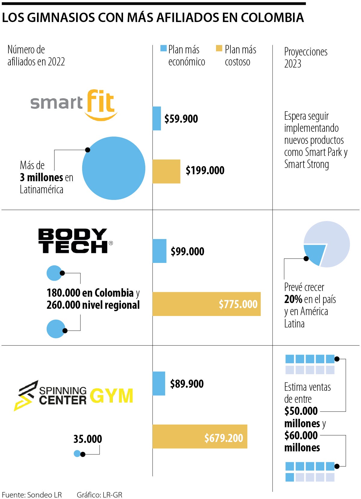 En Colombia, los tres gimnasios más grandes del país por número de afiliados aglomeran más de 400.000 personas en promedio. Encabeza Smart Fit, con más de 280.000 usuarios; Bodytech, con 180.000 clientes; y Spinning Center GYM, con 35.000 deportistas.