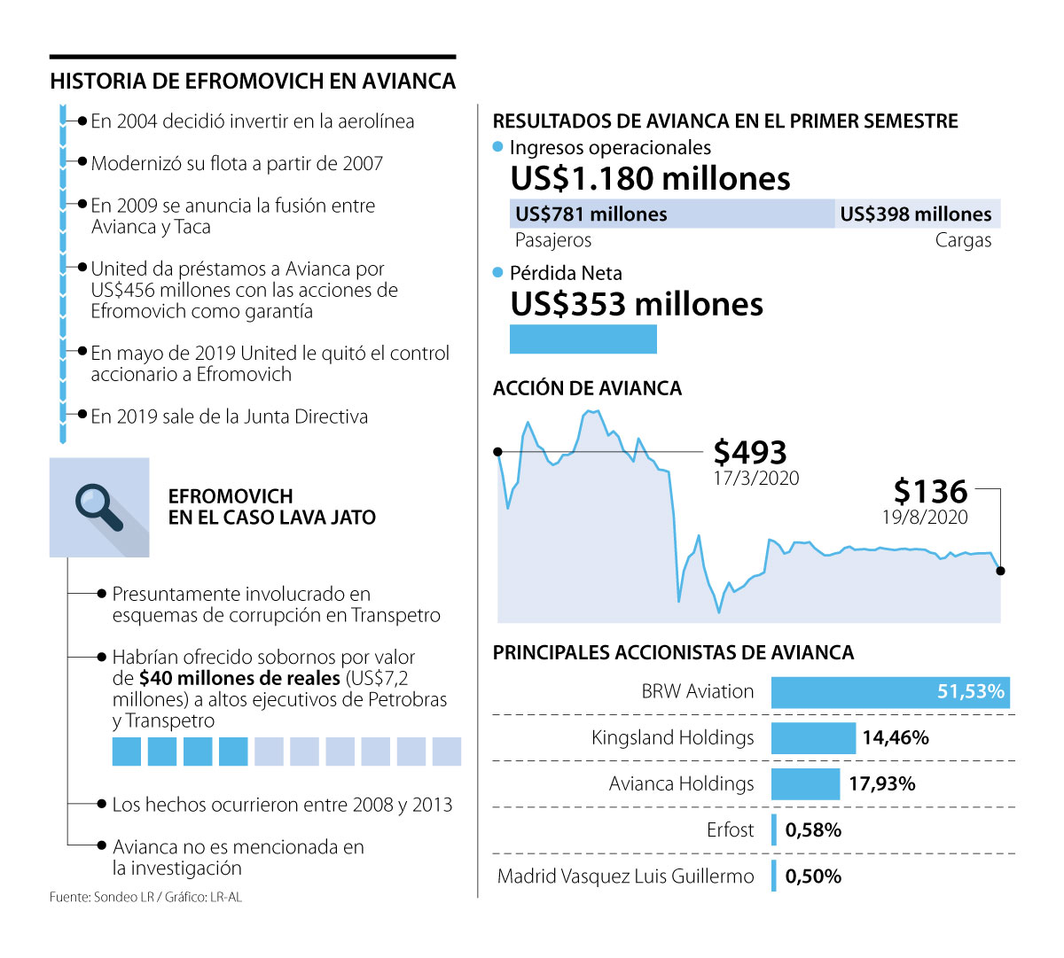 Si bien la aerolínea no se quiso pronunciar sobre el tema, fuentes cercanas recordaron que Germán Efromovich no hace parte de la Junta Directiva desde mayo de 2019, y aunque es el accionista mayoritario, no tiene voz ni voto en las actuales decisiones de Avianca.