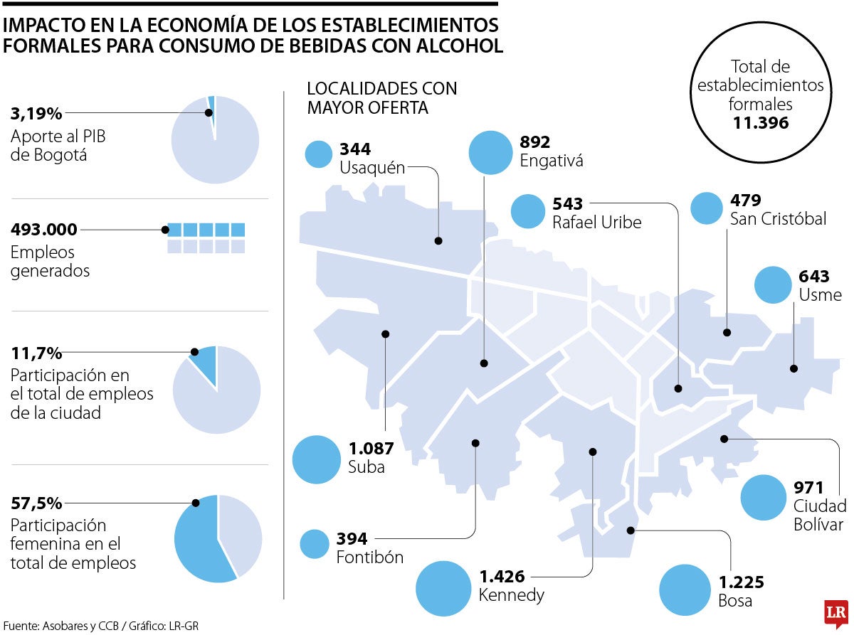 Los establecimientos formales para el consumo de bebidas alcohólicas, según las cifras compartidas por Asobares, generan 3,19% del Producto Interno Bruto, PIB, en Bogotá, tasa que se traduce en $7,6 billones; un movimiento de riqueza que supera, por ejemplo, los presupuestos de ciudades intermedias como Popayán y Cúcuta, que totalizan $830.000 millones y $2 billones, respectivamente.