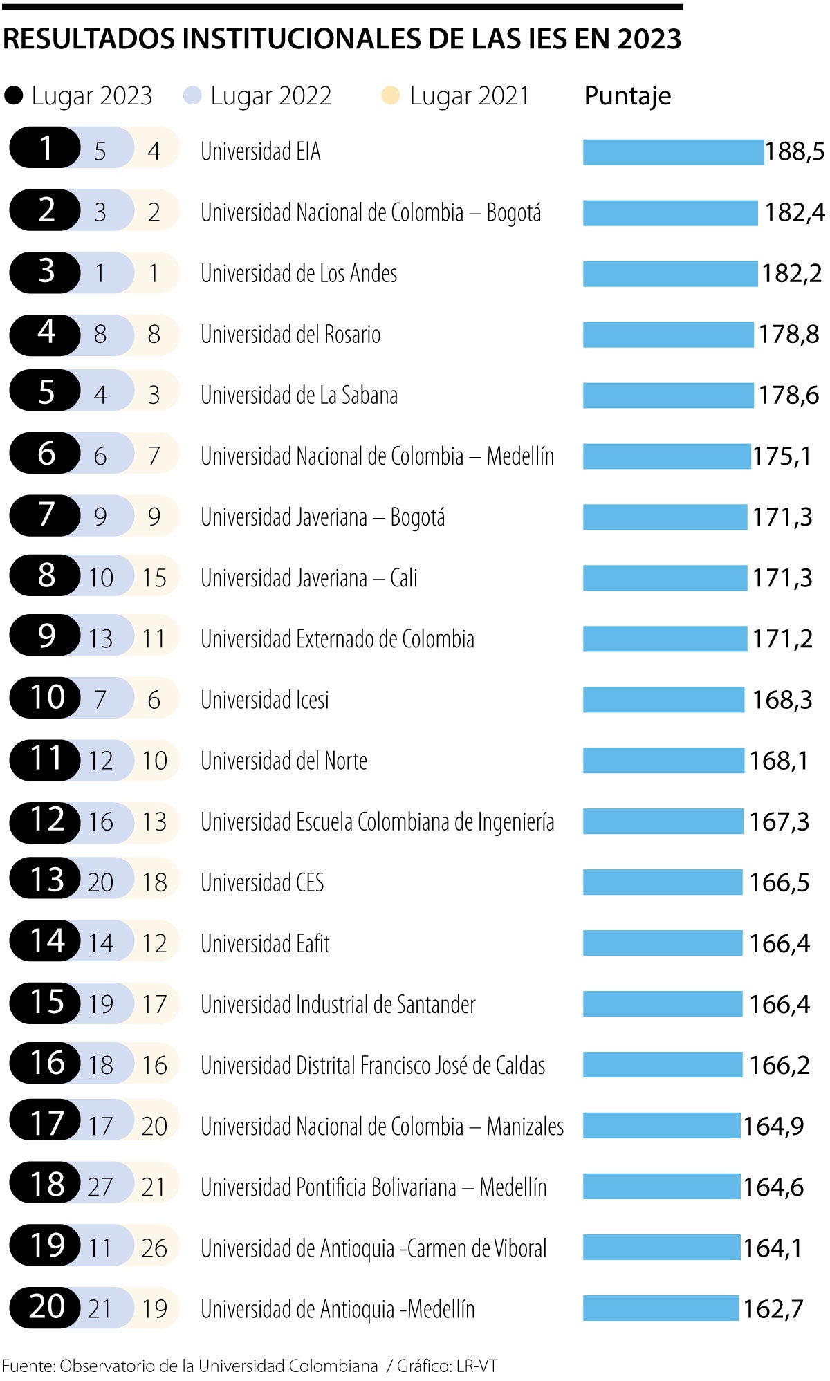 Con estos ítems en mente, la Universidad EIA fue la que obtuvo el mejor puntaje en materia de calidad, pues alcanzó 188,5 puntos; además subió del quinto lugar en 2022 al primero en el ranking del año pasado. La Universidad Nacional de Colombia (sede Bogotá) está en el segundo lugar con 182,4 puntos: escaló un puesto de 2022 a 2023. Sigue la Universidad de los Andes, con 182,2 en materia de puntaje. El top cinco lo completan la Universidad del Rosario y de la Sabana, con 178,8 y 178,6, de forma respectiva.
