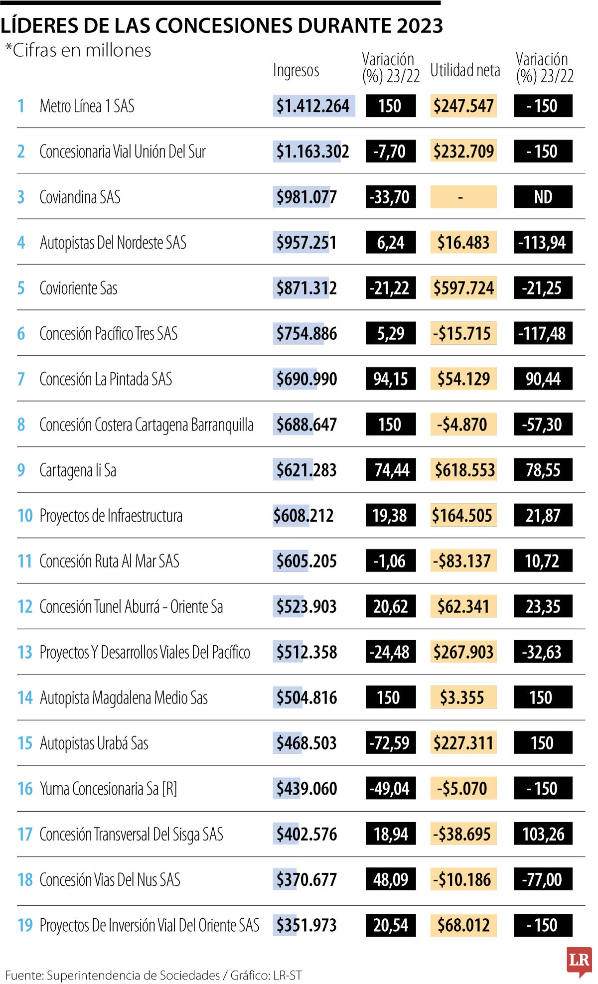 De las cinco primeras en ingresos, sólo hay tres que tuvieron una variación positiva comparada con el año anterior: Metro Línea 1 SAS (más de 150%), Autopistas del Nordeste SAS (6,24%) y Proyectos de Infraestructura (19,38). Las dos restantes presentaron una disminución frente a los datos de 2022: Concesionaria Vial Unión del Sur (-7,70%) y Covioriente (-21,2%).