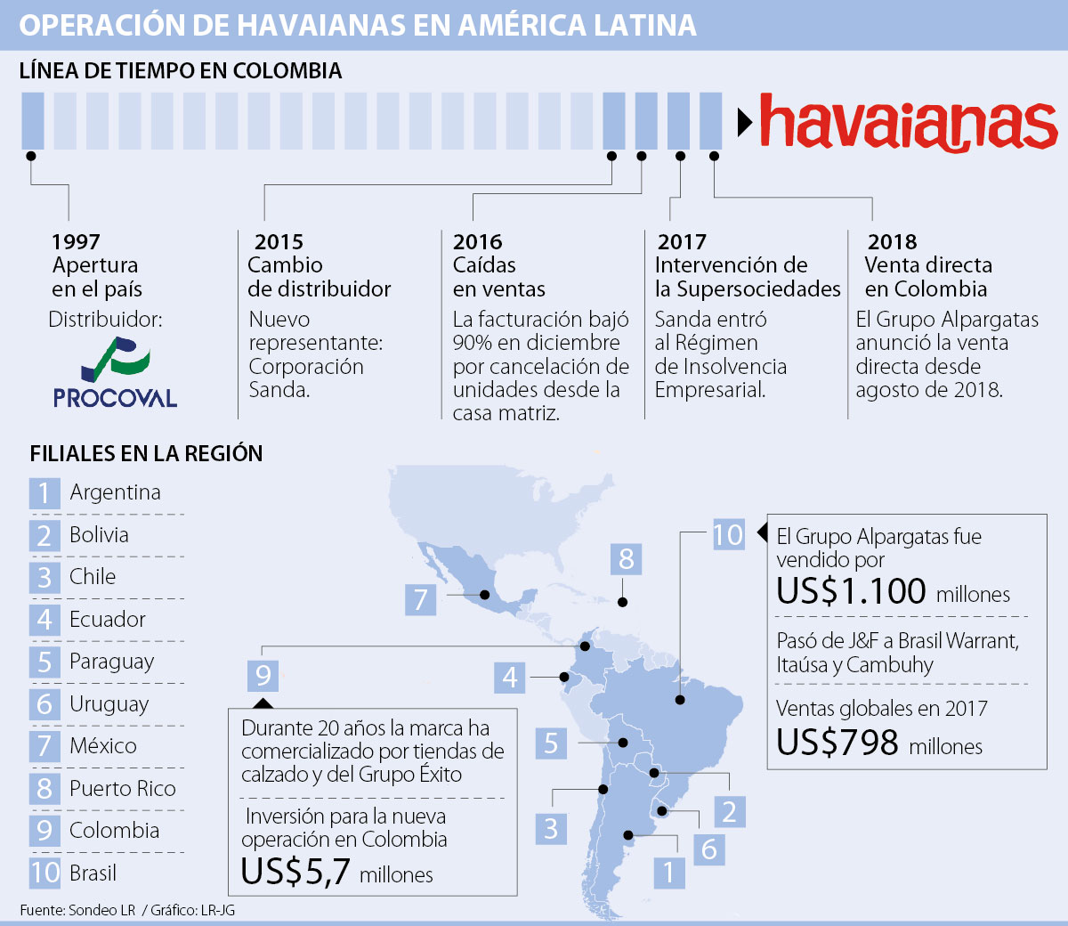 La marca de sandalias Havaianas no es nueva para el mercado colombiano. La operación inició en 1997 y desde entonces, por medio de distribuidores locales, había mantenido la venta intermediada en puntos del Grupo Éxito y comercios dedicados al calzado. Ahora, la compañía que se encuentra en un proceso de reorganización a nivel global, dentro de sus cambios, decidió instalar una filial en el país para vender de manera directa.