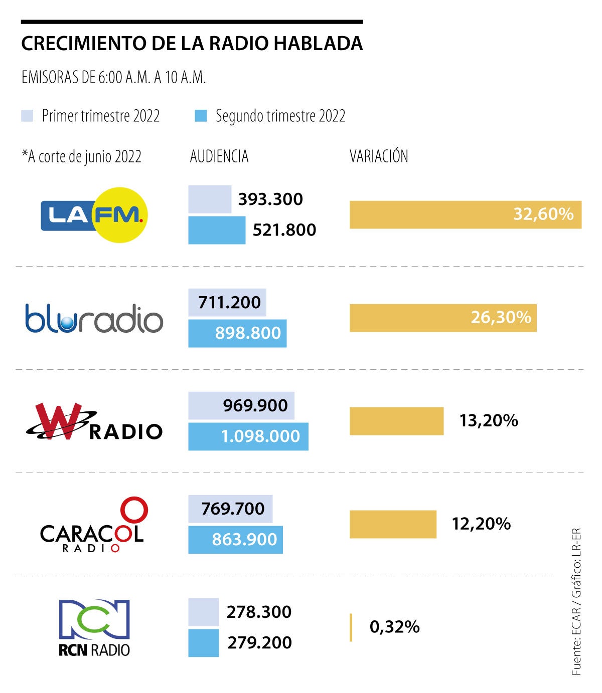 La radio hablada (entre 6:00 a.m. y 10:00 a.m.) mantiene su propia competencia a la hora de conquistar audiencias. A nivel nacional, La FM es la que más crece, 32,6%, si se comparan los 393.300 oyentes que tuvo el primer trimestre de 2022, con los 521.800 que tuvo en el segundo.