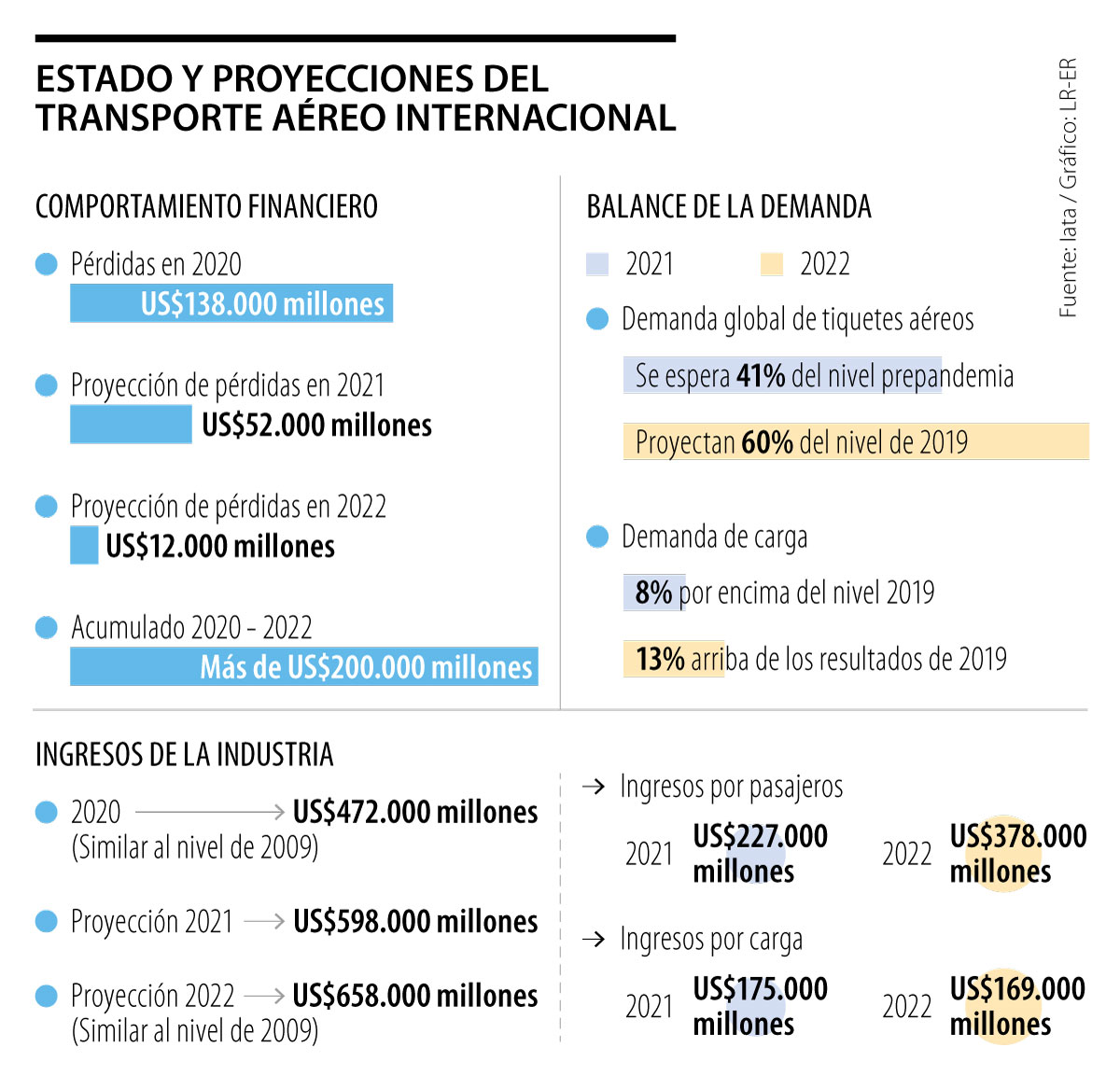 En la Iata, la meta ahora está en que al terminar este año los ingresos crezcan 26,7% en comparación con 2020 cuando fueron US$472.000 millones (similar a los niveles de 2009, es decir, un avance de US$126.000 millones).