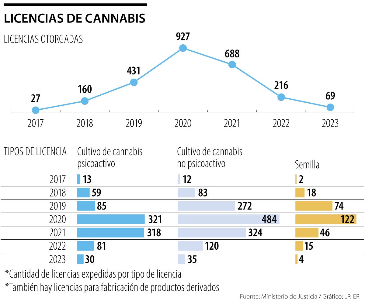 Los datos oficiales sobre el cannabis los compila el Ministerio de Justicia, el cual reveló que, entre 2017 y 2023, se han otorgado 2.518 licencias, siendo 2020 (927) el año con más permisos.