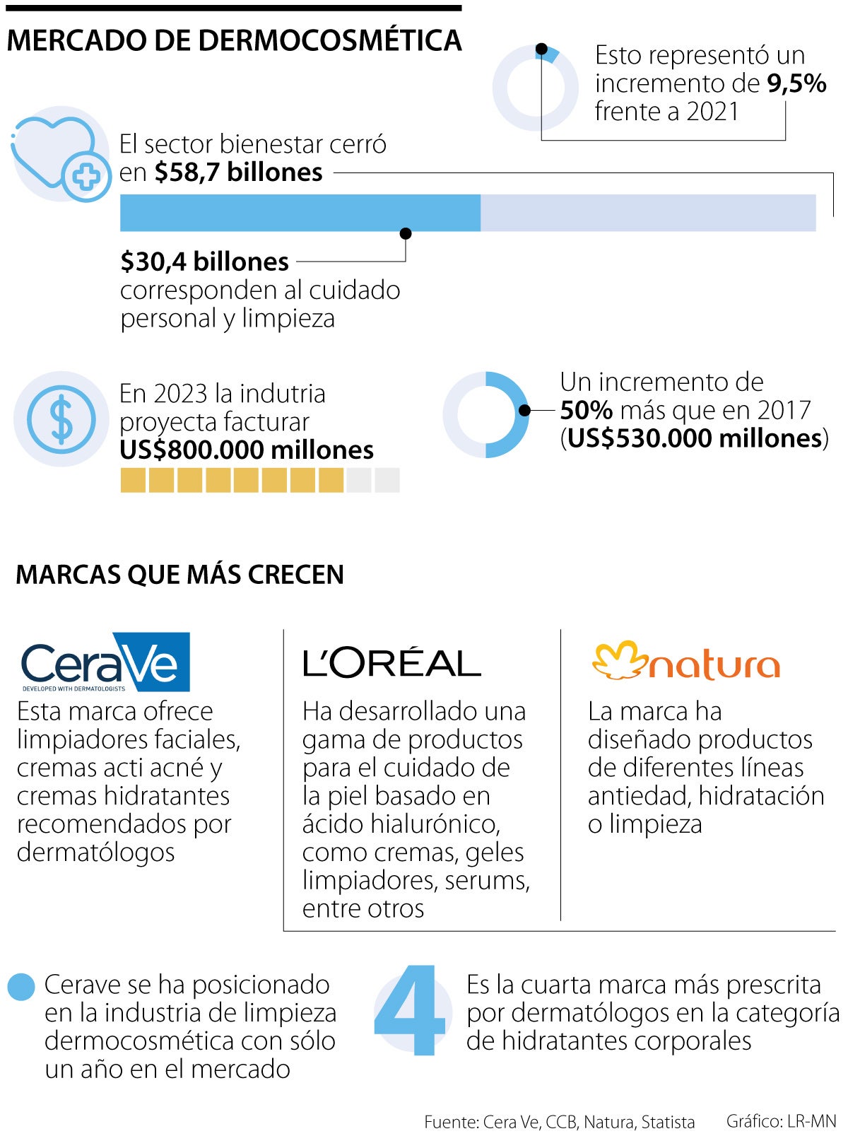 En esta línea hay empresas que han logrado tener un crecimiento de marca como L’Oreal, Natura, Yanbal o Cera Ve. Esta última es una de las marcas que ha logrado posicionarse en el mercado de productos de limpieza cosmética con solo un año de presencia en Colombia, de acuerdo con datos de Lqvia sobre el mercado dermocosmético de enero 2023, comparado con enero 2022. Además, es la cuarta marca más prescrita por dermatólogos en la categoría de hidratantes corporales.
