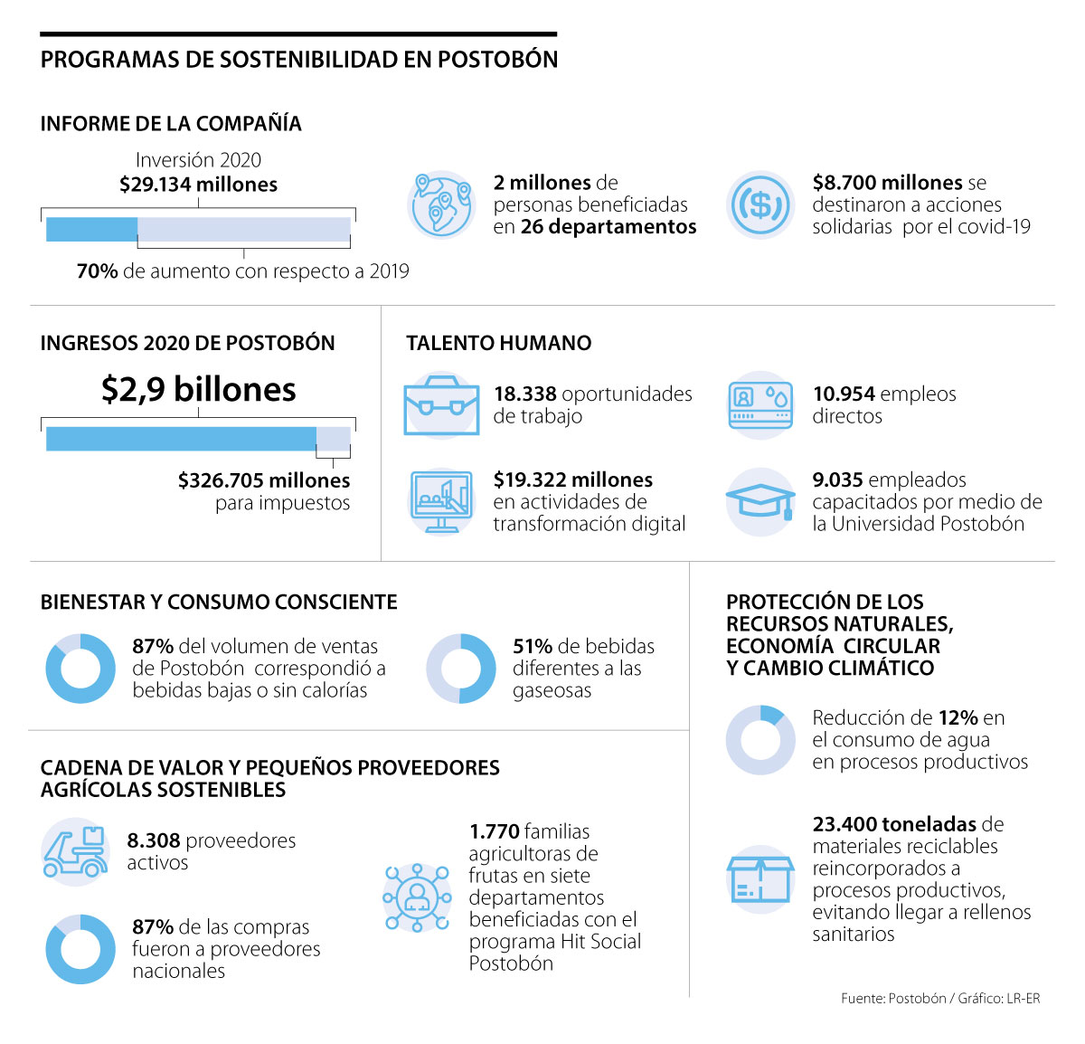 Postobón presentó su informe de sostenibilidad en 2020 y destacó que la inversión hecha en programas socioambientales fue de $29.134 millones, es decir, un alza de 70% frente a 2019.