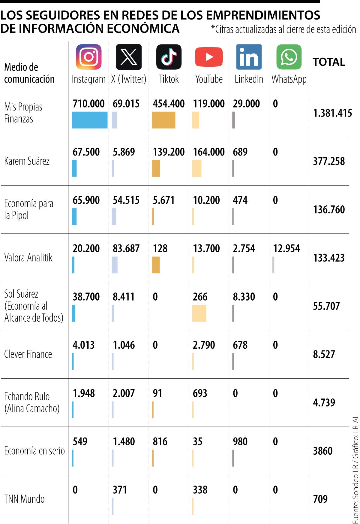En LR hicimos un sondeo de los seguidores que tenían algunos de los principales medios de comunicación económica en redes como Instagram, X, TikTok, YouTube LinkedIn y WhatsApp. Por medio de esta metodología se encontró que en lo alto del ranking se encuentra Mis Propias Finanzas, un medio de comunicación y académico de finanzas y economía creado por Juan Pablo Zuluaga y Carolina Pineda. Actualmente cuentan con 1,3 millones de seguidores en sus redes, siendo Instagram la red social que más followers tiene con 710.000.