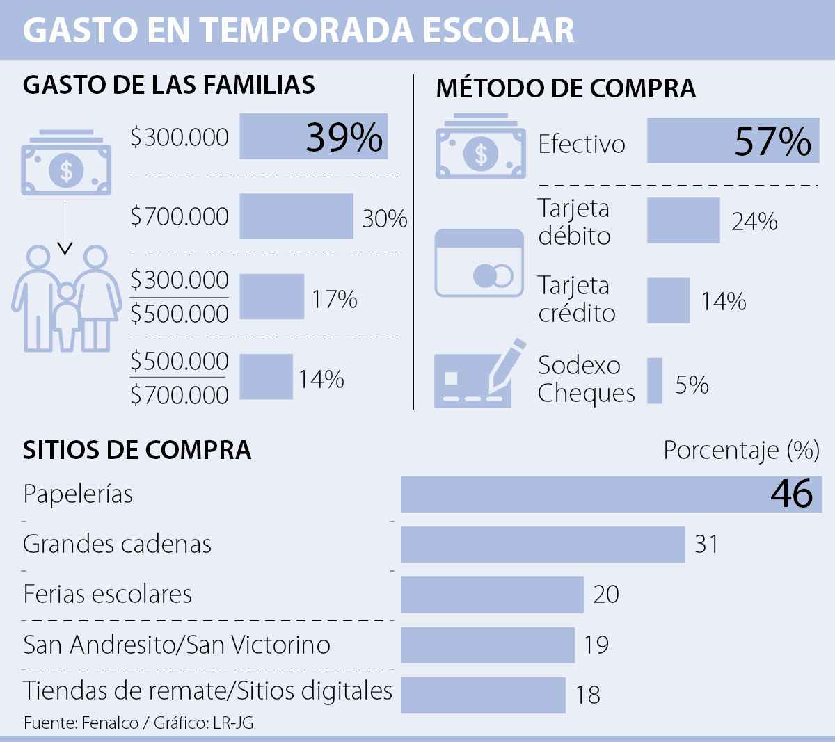 De acuerdo con la última encuesta nacional de la Federación Nacional de Comerciantes (Fenalco) la mayoría de familias colombianas gastará un promedio de $300.000 en la compra de útiles escolares para esta temporada.