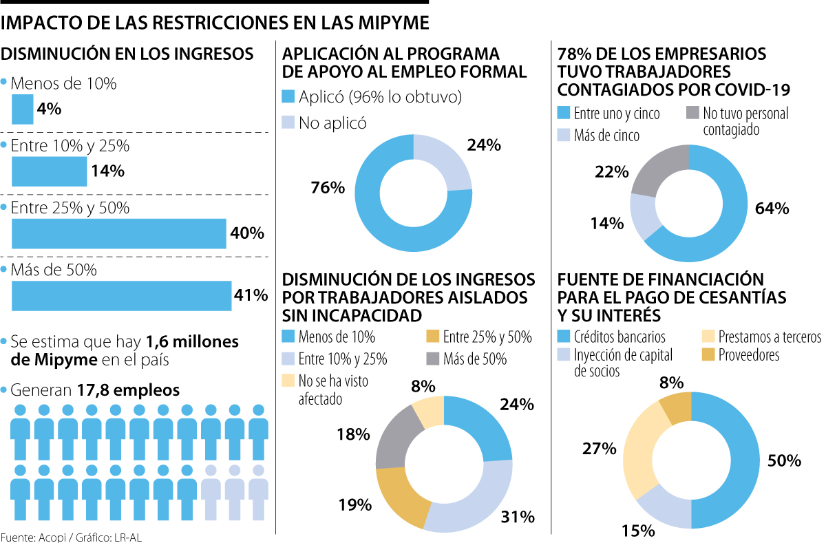 Otros de los hallazgos de Acopi sobre el impacto que la pandemia ha dejado en las Mipyme es una disminución en los ingresos. Más de 50% para 41% de las empresas; entre 25% y 50% para 40%; entre 10% y 25%, 14% y solo 4% en menos de 10% de sus ingresos.
