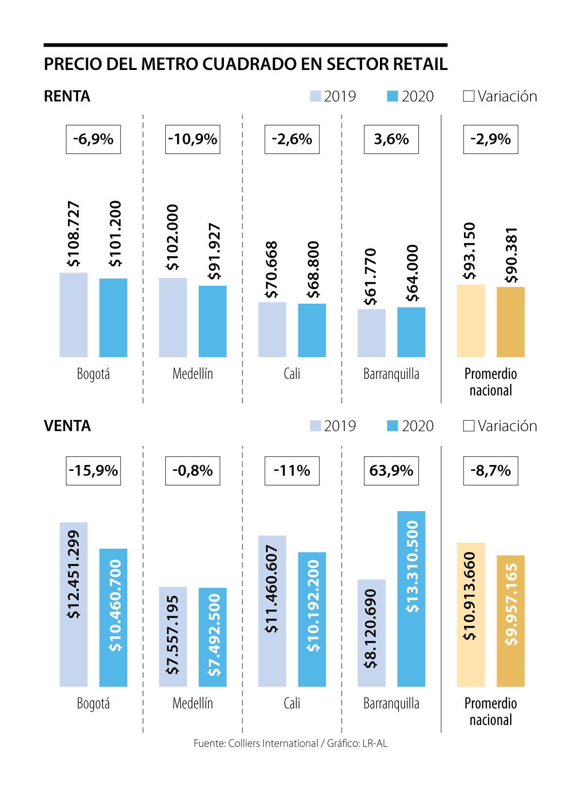 La inmobiliaria Colliers International hizo este estudio en las principales ciudades del país y concluyó que en la gran mayoría este valor decreció y se vieron caídas en los precios de las ventas y los arriendos. De acuerdo con los resultados de la compañía, el precio del metro cuadrado en la renta de locales comerciales tuvo un promedio nacional en 2019 de $93.150 y de $90.381 a julio, con una contracción de 2,9%.