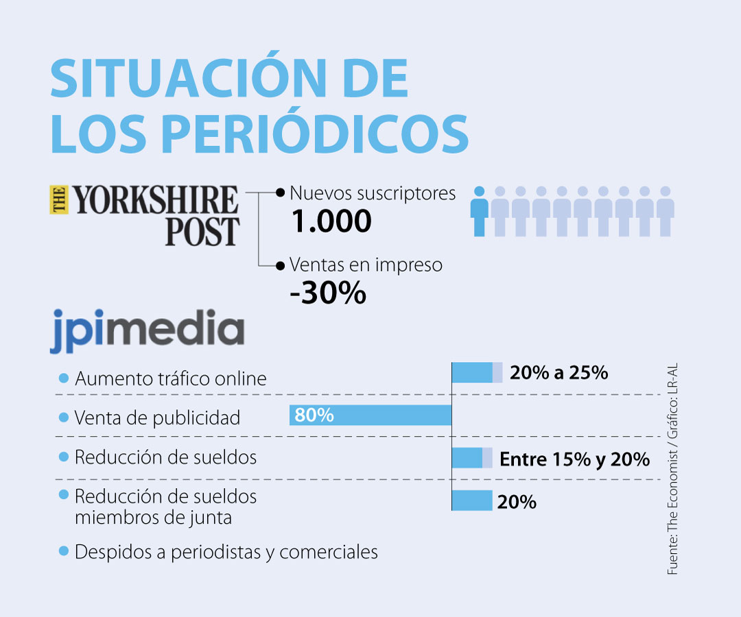 Un ejemplo, anota la revista, es The Yorkshire Post, que sumó cerca de 1.000 suscriptores nuevos en las semanas anteriores. JPIMedia, que maneja esa y otras publicaciones, ha registrado un aumento de tráfico de 25% en sus páginas web; sin embargo, las ventas globales del periódico han caído 30% durante la cuarentena, según el editor James Mitchinson. Incluso, en algunos títulos de JPI la caída en publicidad ha ascendido hasta 80%, por lo que la fuerza comercial y varios periodistas han perdido sus puestos de trabajo y, los que quedan, asumieron una reducción salarial de entre 10% y 20%.