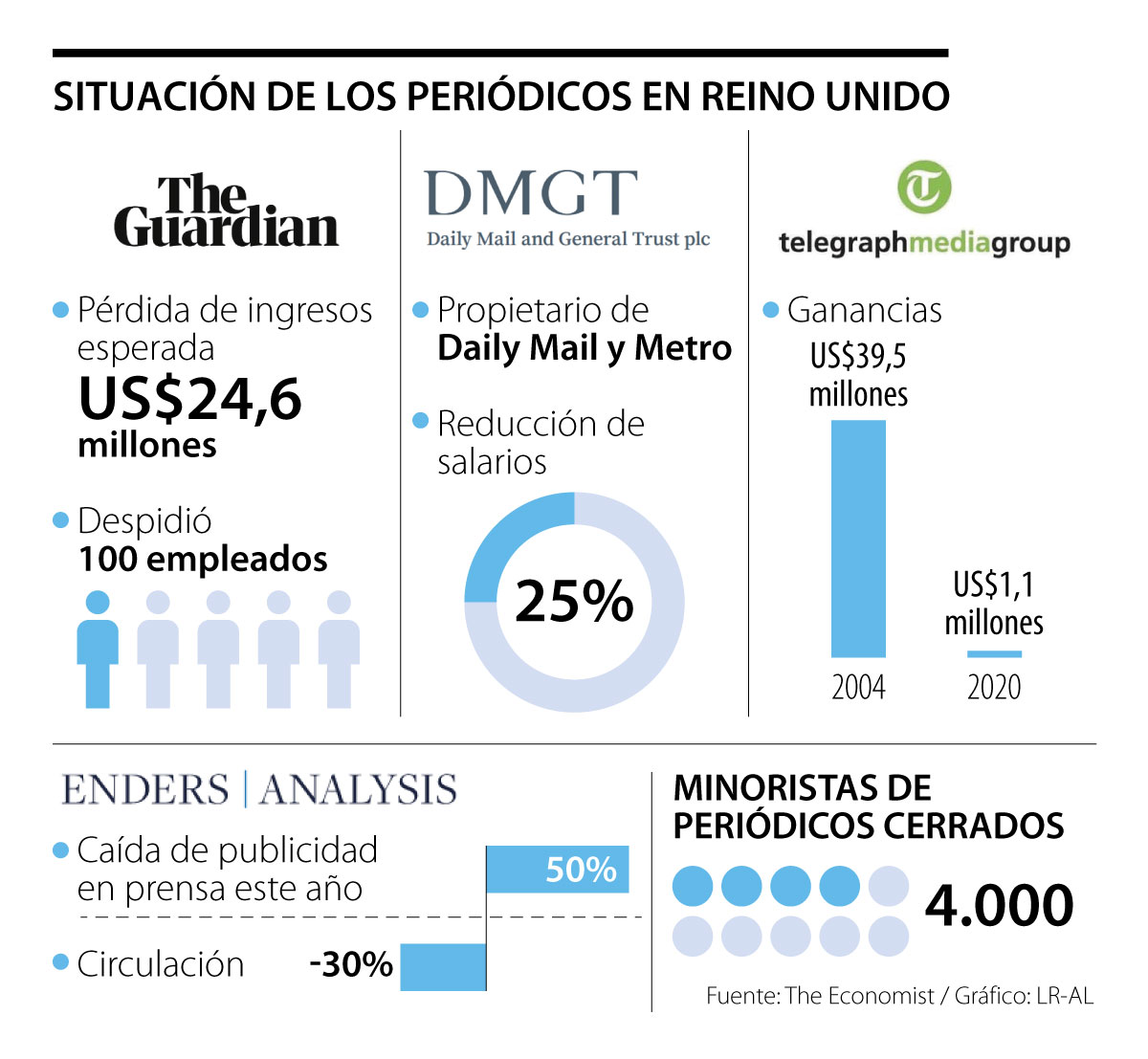 El panorama es similar en medios como The Guardian, que espera una caída de US$24 millones en sus ingresos (equivalente a 10%) y despidió a 100 miembros de su equipo, o General Trust, propietario del Daily Mail y Metro, que redujo los salarios hasta 25%. Los periódicos británicos, explica la publicación, sufren en mayor medida el impacto de las cuarentenas, pues dependen más de la venta en quioscos que sus pares en Europa y Estados Unidos.
