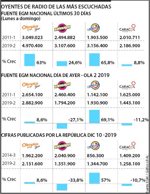 Las cuatro emisoras más escuchadas de la radio en Colombia suman ocho millones de oyentes y han crecido 2,15% en los últimos cinco años, así lo muestran las cifras del Estudio General de Medios Ola 2 de 2019. Sin embargo, la cifra de audiencias es mayor si se analiza un periodo de tiempo más largo.